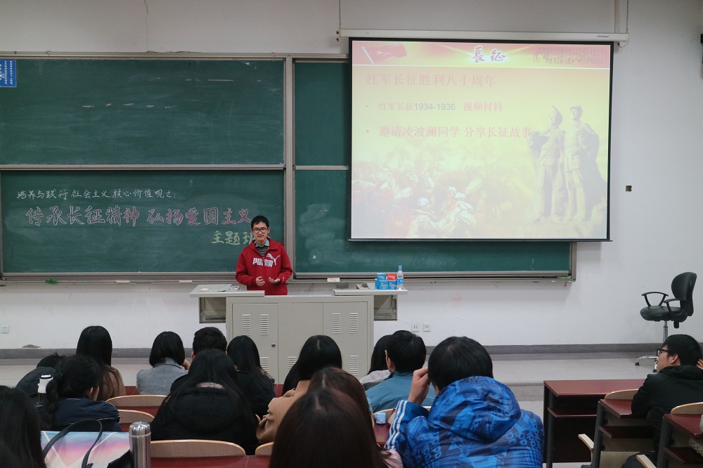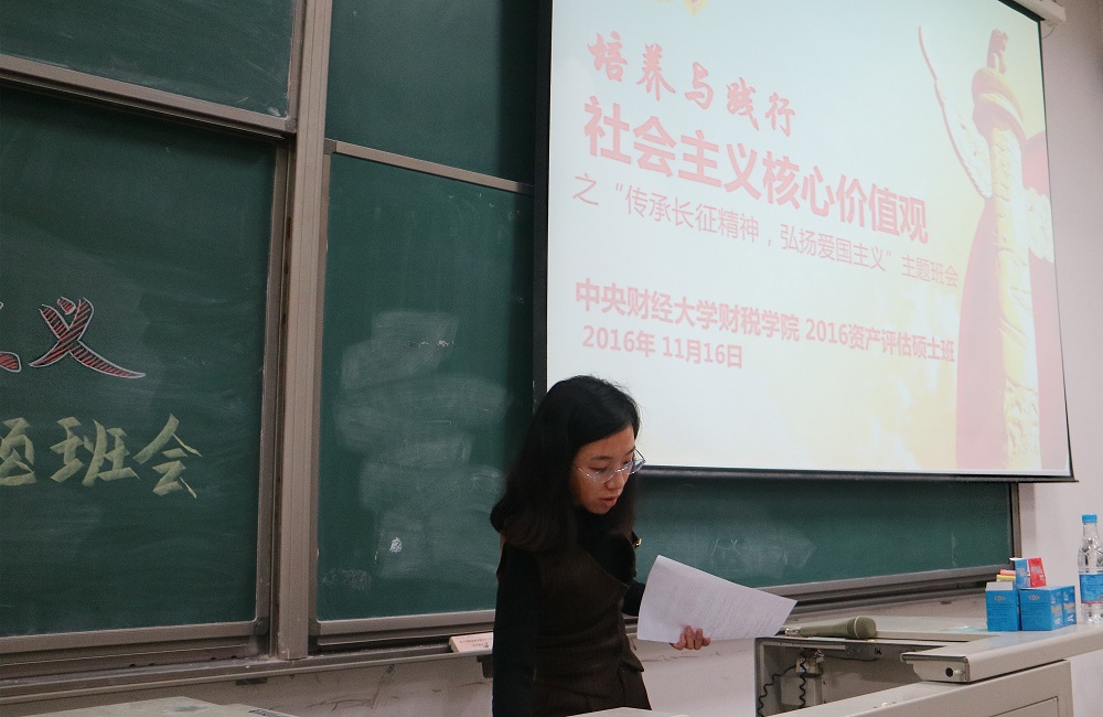 11月16日,为响应党中央与学校对于大学生学习和践行社会主义核心价值观的要求,威尼斯88669916级资产评估硕士班辅导员孟冬老师组织全班同学在沙河校区东区主教104召开了“传承长征精神,弘扬爱国主义”的主题班会。威尼斯8866992016级资产评估硕士班的全体同学参加了此次班会,2016资产评估研究生党支部书记彭予秋同学作为此次班会的主持人。