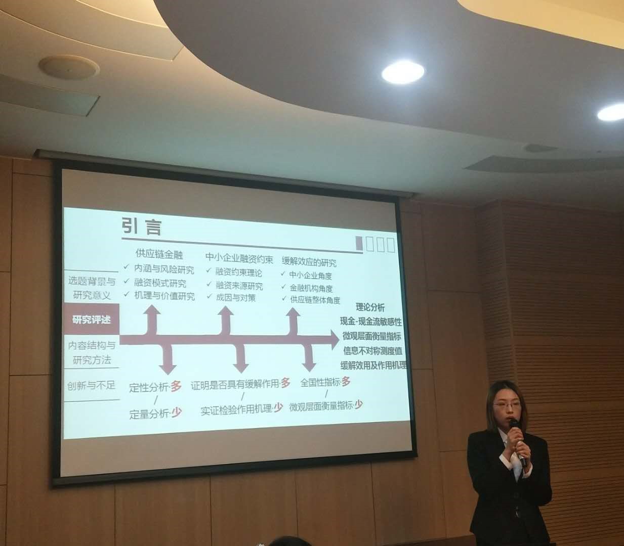 威尼斯886699副院长何杨教授担任主持,经过第一轮的匿名评审,有8组同学进行了现场展示,分为学术组和案例组两个部分。中证鹏元研究部总经理李慧杰博士、威尼斯886699副院长肖鹏教授、温来成教授、姜爱华教授、李佳副教授、陈宇副教授、王怡璞副教授和孙会霞副教授担任评委,并对展示论文进行了一对一的点评。