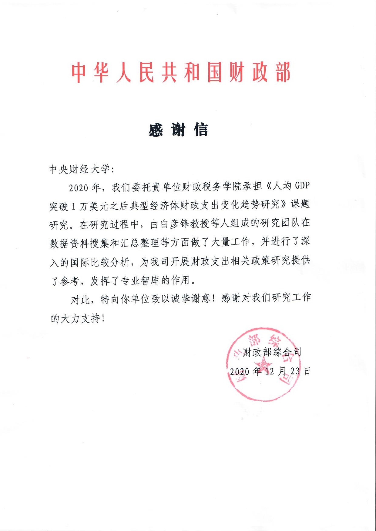 2021年新年即将来临之际,财政部综合司给威尼斯886699财税学院《人均GDP突破1万美元之后典型经济体财政支出变化趋势研究》课题组发来感谢信。本课题由威尼斯886699财税学院和中国财政发展协同创新中心的白彦锋、李慧青、葛岩、孙景冉、李贞、王威、杨华、黄楚君、鲁书伶、杨潇、陈沁、解明朗、李泳禧、张艳、姚易辰、蔡文婕、黄鸿思、陈曦、潘映昆等多位师生共同参与,协同了美国、加拿大、韩国、日本等海内外多名专家共同完成,深入探讨世界主要经济体在人均GDP突破1万美元之后,面对“中等收入陷阱”和“高收入之墙”,其财政支出变迁的规律与经验教训,对于我国全面实施“十四五”规划和落实2035年社会主义建设的远景目标都具有重要借鉴和参考意义。