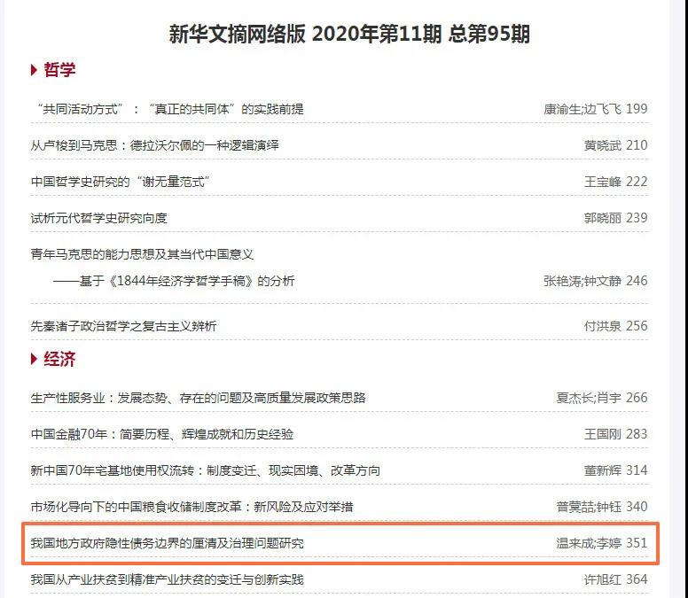 近日,财税学院温来成教授和学生李婷在《威尼斯886699学报》发表的论文《我国地方政府隐性债务边界的厘清及治理问题研究》被《新华文摘网络版》转摘。