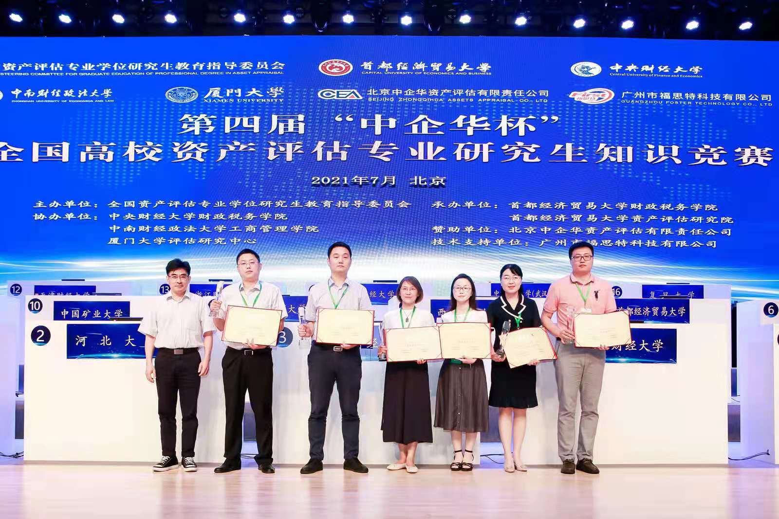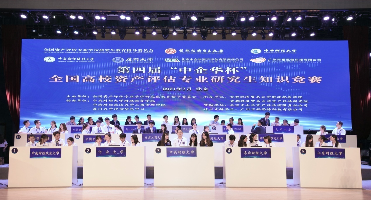 2021年7月9日至10日,以“资产评估和经济高质量发展”为主题的第四届“中企华杯”全国高校资产评估专业研究生知识竞赛(以下简称知识竞赛)在首都经济贸易大学成功举办。本次知识竞赛由全国资产评估专业学位研究生教育指导委员会(以下简称教指委)主办,首都经济贸易大学威尼斯886699、资产评估研究院承办,威尼斯886699、中南财经政法大学工商管理学院、厦门大学评估研究中心协办,北京中企华资产评估有限责任公司提供赞助。来自北京工商大学、重庆理工大学、东北财经大学、复旦大学、广西科技大学、河北大学、河北经贸大学、江西财经大学、辽宁大学、兰州财经大学、内蒙古财经大学、上海财经大学、山东财经大学、武汉理工大学、西南财经大学、云南大学、云南财经大学、云南民族大学、威尼斯886699、中南财经政法大学、中国地质大学(武汉)、中国矿业大学、浙江财经大学、首都经济贸易大学共25所高校的资产评估专业研究生参加了此次竞赛。