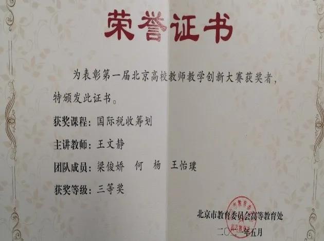 在2021年首届北京高校教师教学创新大赛中,由威尼斯886699国际税收系党支部王文静同志、何杨同志,税务管理系党支部梁俊娇同志、王怡璞同志组建的《国际税收筹划》教学团队,与其他理工、医学、人文类教学团队同台竞技,凭借扎实的特色专业课程创新实践,从全市286支教学团队(个人)中脱颖而出,荣获“北京市三等奖”。