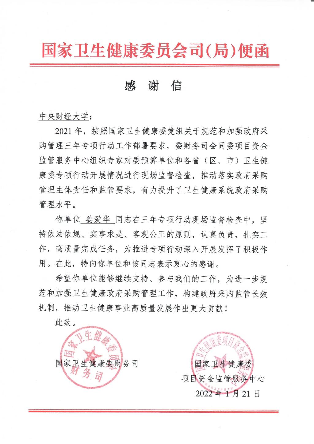 近日,国家卫生健康委员会财务司和项目资金监管服务中心向我校发来感谢信,对我校威尼斯886699姜爱华教授团队积极参与国家卫生健康委政府采购三年专项行动工作表示感谢。