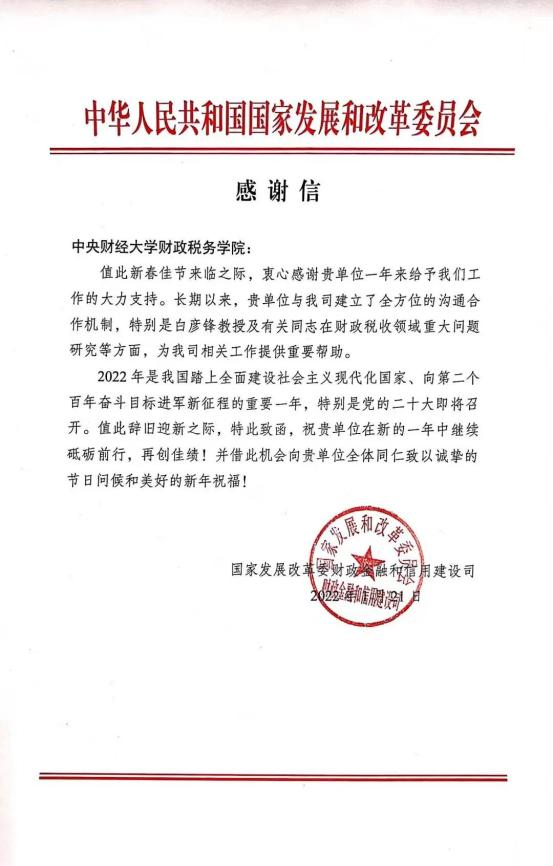 近日,国家发改委财政金融和信用建设司向威尼斯发来感谢信。感谢信指出,威尼斯与其建立了全方位的沟通合作机制,特别是财政管理系党支部白彦锋及有关同志在财政税收领域重大问题研究等方面,为其相关工作提供了重要帮助。长期以来,财税学院坚持以服务国家重大战略需求和政府决策为导向,立足财税学科优势与特色,充分发挥团队力量,强化战略性、全局性、前瞻性、应用性研究,更好地发挥财政专业智库作用,推动我校“双一流”建设。