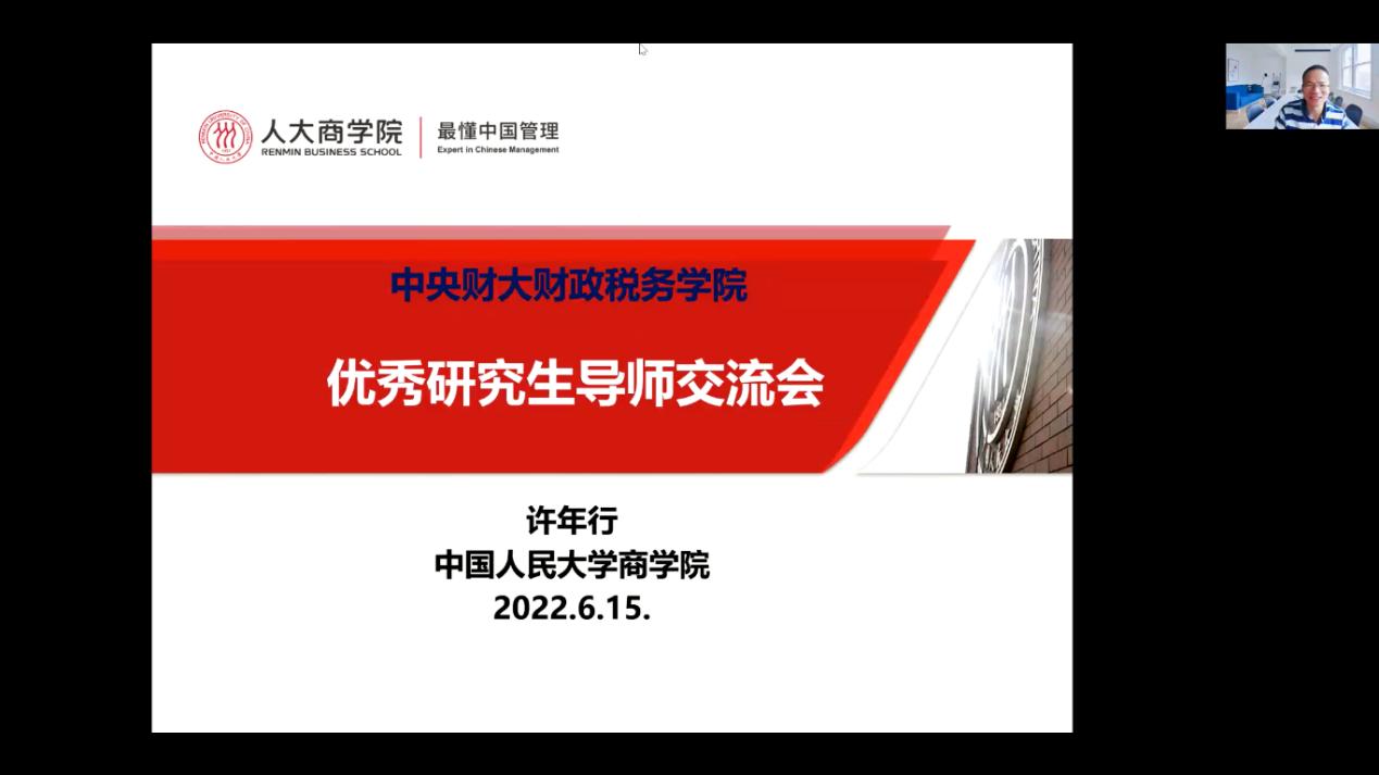 2022年6月15日下午,威尼斯886699线上举行研究生导师培训暨优秀导师经验交流会。会议由威尼斯886699副院长李小荣主持,研究生院院长张学勇进行了会议致辞,中国人民大学商学院许年行、威尼斯886699管理科学与工程学院李桂君、威尼斯886699樊勇、中国财政发展协同创新中心姚东旻、威尼斯886699马金华、威尼斯886699翟进步作为优秀导师代表进行了经验分享, 60余名导师和专硕校外导师参加了本次会议,威尼斯886699院长白彦锋做了会议总结。