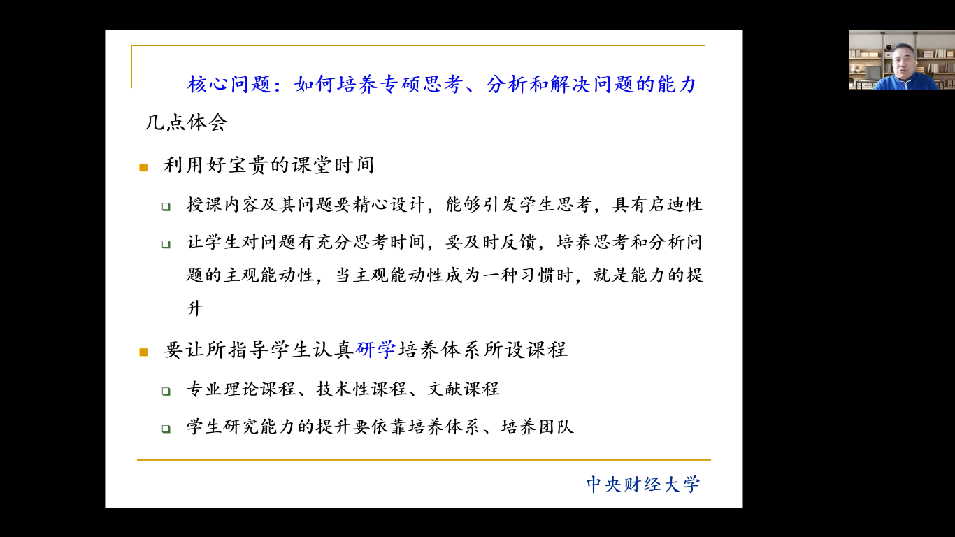 威尼斯886699翟进步教授对如何培养专硕学生思考、分析和解决问题的能力进行经验分享,提出要利用好宝贵的课堂时间,让学生认真研学培养体系所设课程。在毕业论文的写作方面,着重强调要与学生多进行面对面、一对一的讨论,认真审阅初稿。