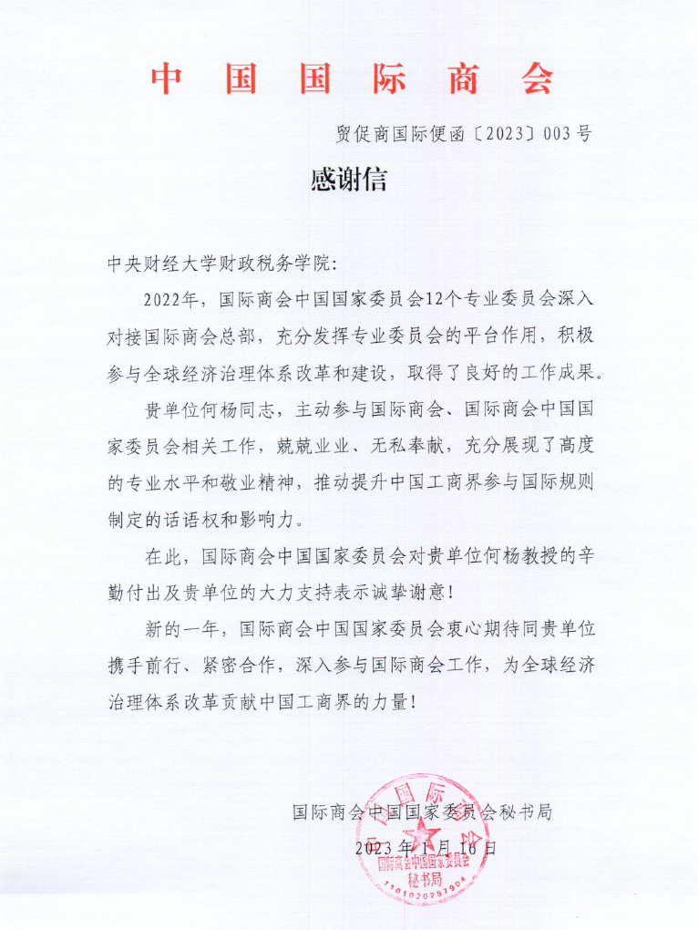 近日,中国国际商会向我校威尼斯886699发来感谢信,感谢我校威尼斯886699何杨教授团队积极参与国际商会、国际商会中国委员会相关工作,为推动提升我国工商界参与国际规则制定的话语权和影响力做出贡献。