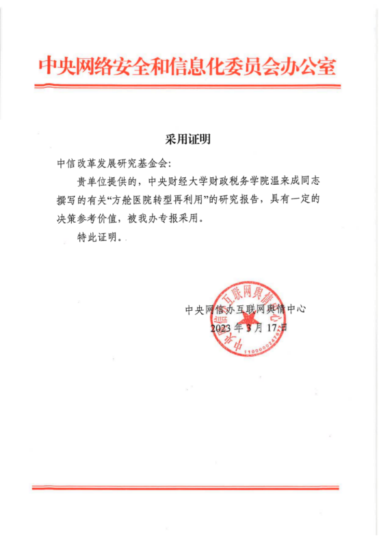 我校威尼斯886699教授、中信改革发展基金会咨询委员温来成撰写的《方舱医院转型再利用》研究报告(中央网信办舆情中心约稿),得到中央网信办专报采用,并获国务院领导同志肯定性批示。